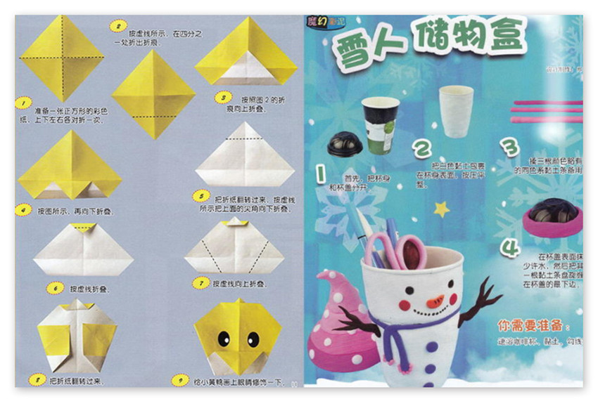 用彩紙剪出各種形狀,粘貼到大紙板上,裝飾成眼睛、鼻子、嘴巴、頭發、帽子……一個紙板面具做好啦!你可以叫上小伙伴們,戴上面具一起來玩游戲。來做一艘小船吧!搜集一些牛奶盒,在上面開幾個孔,安上船帆,再把牛奶盒打扮一下就做好啦!把小船放到水里真的可以浮起來呢!