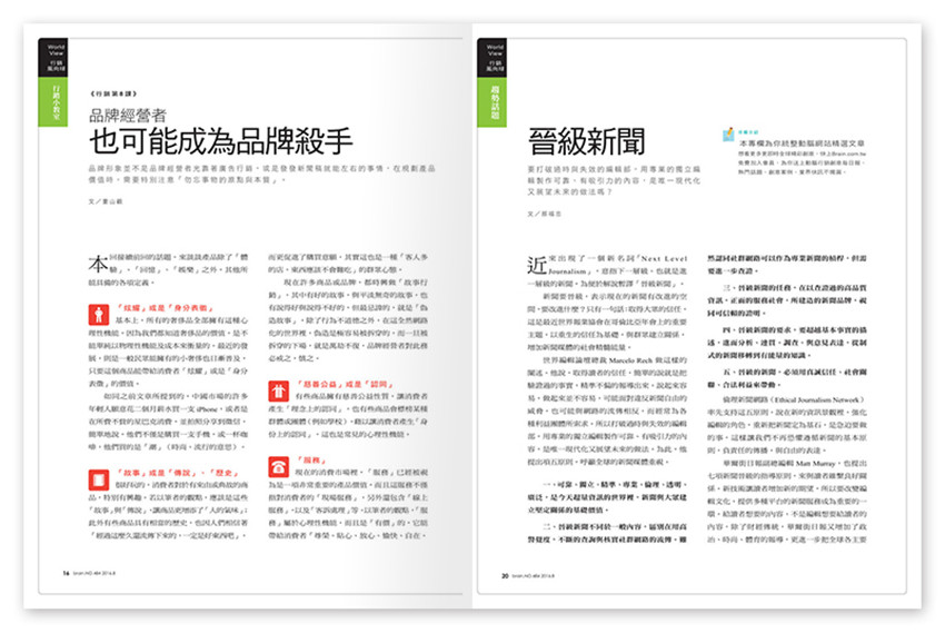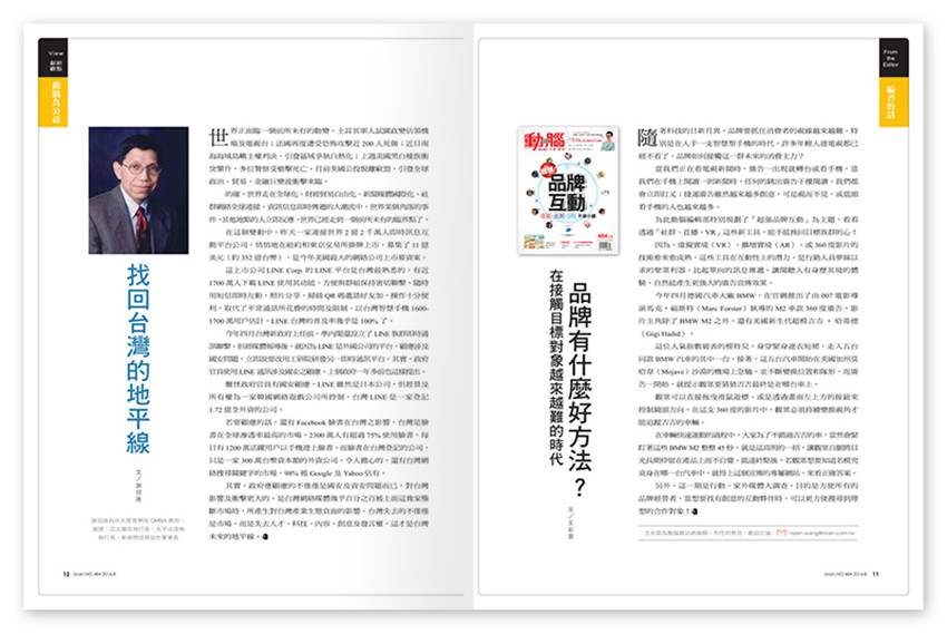 《動(dòng)腦》多元豐富的產(chǎn)品除雜志外,另有Brain.com數(shù)數(shù)位平臺(tái)、動(dòng)腦講座、及動(dòng)腦俱樂部、叢書出版、動(dòng)腦考察團(tuán)及廣告獎(jiǎng),滿足讀者各項(xiàng)需求。,廣告行銷媒體圈瞭望者的角色;讀者涵蓋臺(tái)、中、港、新、馬、美國等地華文廣告界。