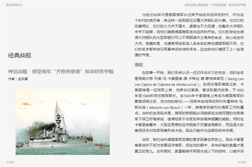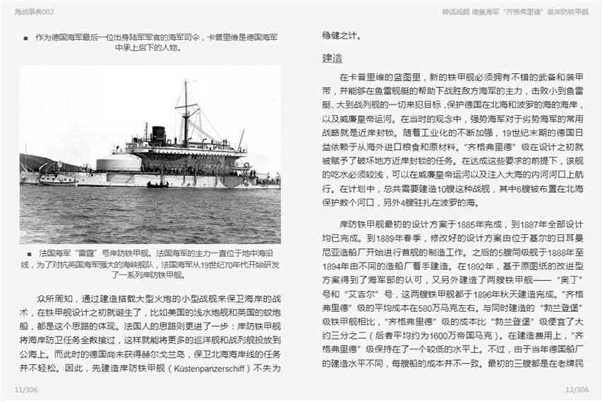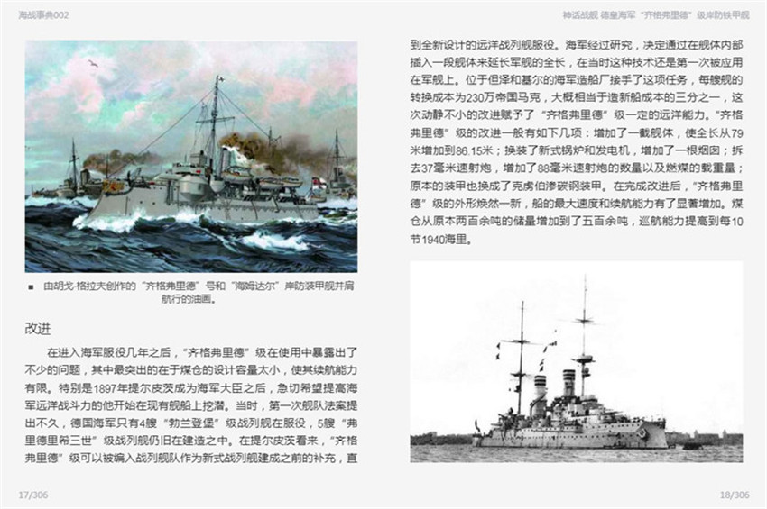 在德國海軍從小到大、從弱到強的歷史里,“齊格弗里德”級岸防鐵甲艦既是親歷者,也是旁觀者。大批合格的海軍官兵從“齊格弗里德”級上走下,來到其他的新戰艦上。它們的兢兢業業讓我們發現了積沙成塔的力量,《神話戰艦:德皇海軍“齊格弗里德”級岸防鐵甲艦》從“緣起”、“建造”、“技術指標”、“改進”、“歷史”數方面細敘了這組以日耳晏神話史詩和傳說命名的岸防鐵甲艦,文中還穿插了一些命名的背景故事,圖文薈呈,頗具浪漫氣息。