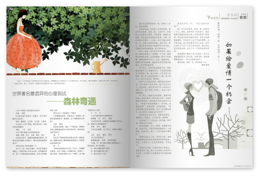 一本貼心的全新兩性期刊,在廣大讀者心目中有著不可替代的位置,時(shí)尚、新潮、精美、典雅,鮮明的個(gè)性和不俗的親和力,使一批又一批讀者成為自己的朋友,真的應(yīng)了原來刊物扉頁的一句話;"你我一次偶然,將會(huì)成為永遠(yuǎn)"。是女性朋友值得信奈的好朋友,定位為18-40歲的女性讀者,倡導(dǎo)自尊、自愛、自信、自立、自強(qiáng)的新時(shí)代女性精神,深受廣大讀者的推崇和喜愛。