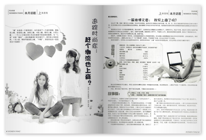 通過處在世紀(jì)之交的現(xiàn)代女性心靈路程的揭示和成長(zhǎng)經(jīng)歷的記錄,以及與她們所思所想所憂所喜的溝通和交融,描繪出了當(dāng)今女性真切的生存狀態(tài)、多維的生活方式和追求,以清新活潑的文風(fēng),犀利獨(dú)到的目光,精致大方的裝幀,水乳交融的文圖吸引著人們,成為都市知識(shí)女性白領(lǐng)麗人的精神享受,成為年輕女孩及大學(xué)生的良師益友。