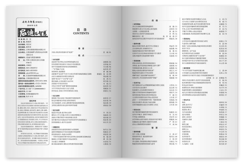 《啟迪與智慧》主要欄目:本刊視野、心理健康、能力培養(yǎng)、課題研究、閱讀與寫作、外語(yǔ)教學(xué)、數(shù)理化園地、政史地、教育藝術(shù)、教學(xué)智慧、學(xué)習(xí)策略、課堂感悟、管理技巧。