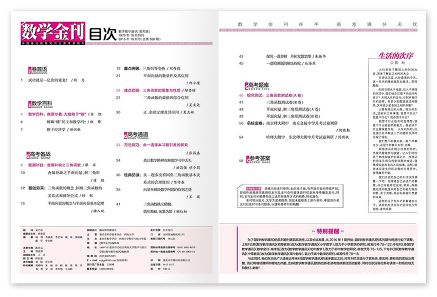 《數學教學通訊·數學金刊》主要欄目:卷首語、六大主千知識、四大重要思想、高考模擬金卷,等。
