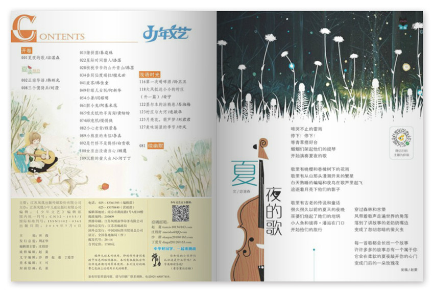 《少年文藝》(月刊)創刊于1976年,多年來雜志內容及形式方面與時俱進,并以其形式和內容的豐富性及多樣性,贏得了不同階層讀者的喜愛與擁護。為少年提供精彩有益、感同身受的閱讀體驗,也為他們提供不拘一格抒寫真情實感的空間,是一份在青少年及家長老師當中擁有良好口碑的品牌刊物。