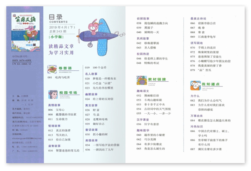 《實(shí)用文摘》真情故事、益智故事、名人故事、哲理故事、成長故事、幽默故事、童話故事、偵探故事、勵(lì)志故事、科幻故事、校園熱讀;趣味語文、課延知識、開心成語、讀寫園地;為什么、萬事由來、冷熱知識、文明禮儀、煉意志、健體格好心情等。