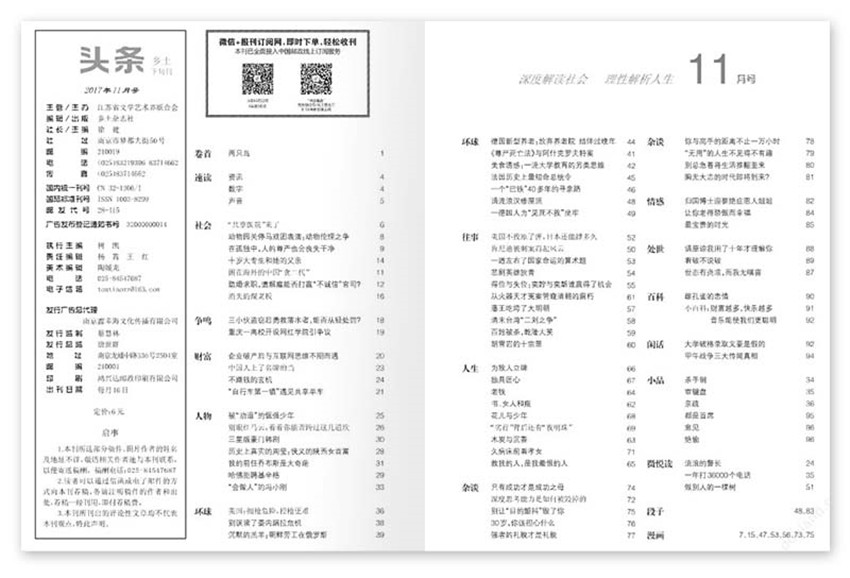 《鄉(xiāng)土·頭條》雜志每期從1萬余種書報刊中精選文章,對當前的熱點事件進行深度披露,對各類社會現(xiàn)象展開多角度探析,對新鮮觀點與爭鳴作系統(tǒng)介紹,對紛繁復(fù)雜的人生作哲理性思考。雜志內(nèi)容涉及社會、人生、人物、文史、海外等各類經(jīng)典文章,傳遞有關(guān)為人、立世、創(chuàng)業(yè)、發(fā)展的不朽價值,是你行走社會的生存讀本。雜志每期從1萬余種書報刊中精選文章,對當前的熱點事件進行深度披露,對各類社會現(xiàn)象展開多角度探析,對新鮮觀點與爭鳴作系統(tǒng)介紹,對紛繁復(fù)雜的人生作哲理性思考。雜志內(nèi)容涉及社會、人生、人物、文史、海外等各類經(jīng)典文章,傳遞有關(guān)為人、立世、創(chuàng)業(yè)、發(fā)展的不朽價值,是你行走社會的生存讀本。