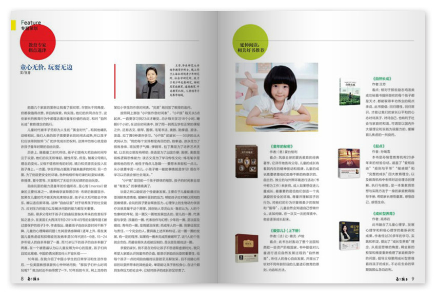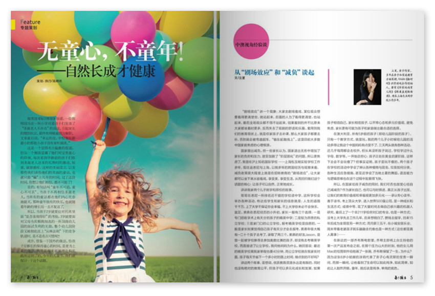 《為了孩子》關注年輕媽媽的生活狀態,更多融入了兒童時尚類的流行因素,涉及兒童時尚,現代兒童身心健康、新兒童用品信息,兒童網絡動態等多方面的內容。力求滿足幼兒及其家長的現實需求。