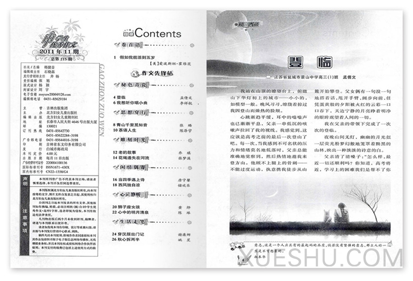 提倡“說真話,做真人”為辦刊宗旨,故深受中學師生歡迎,主要欄目:金素材、時文素材、名校作文、作文講堂、在路上、作文素材實戰(zhàn)點擊、滿分作文讀解、新格言等。